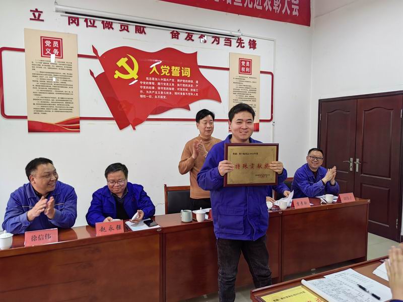 公司副總經理趙永強宣讀了《關于兌現(xiàn)2024年度安全承包獎的決定》、《關于表彰2024年度先進班組和先進個人的決定》,對2024年年度工作中作出突出貢獻的炭材運行三班先進班組、柴彬等8名先進個人予以表彰,并頒發(fā)了先進集體獎等四項集體獎牌以示鼓勵。